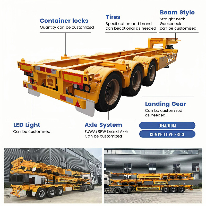 تم اختيار كل عضو هيكلي لتحقيق توازن عملي بين القوة والوزن. يوفر الهيكل الفولاذي عالي القوة الدعم لنقل الحاويات بأمان بينما يقلل التصميم الهيكلي المُحسن من الوزن الفارغ لتحسين سعة الحمولة وكفاءة استهلاك الوقود. تقوم العارضات المعززة وأقفال الالتواء المعتمدة بتأمين الحاويات أثناء النقل، مما يحافظ على ثبات البضائع في ظروف الطرق المختلفة.