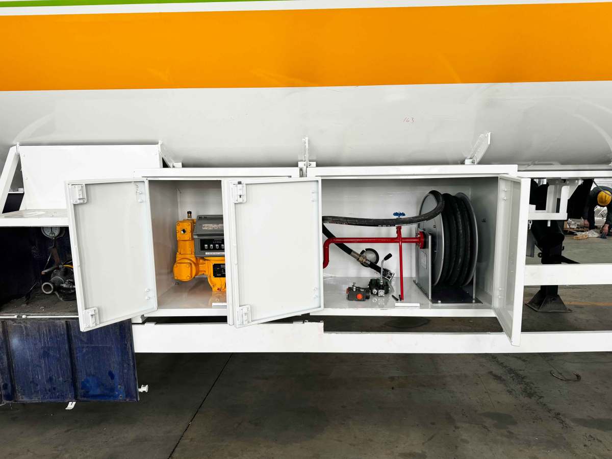La seguridad está integrada en todo el remolque: válvulas de seguridad dobles limitan eventos de sobrepresión, un corte de emergencia aísla el flujo en situaciones peligrosas, y un marco anti-volcaduras reduce el riesgo durante maniobras evasivas. Medidores de nivel y termómetros de alta precisión proporcionan un monitoreo preciso y en tiempo real de las condiciones del tanque, apoyando la carga, el tránsito y la descarga seguros. Se incluye un sistema de conexión a tierra antiestática para disipar la carga estática durante el manejo del combustible.