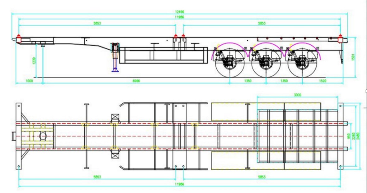 The core foundation of our 12m container skeletal trailer is forged from Q345B high-tensile structural steel. By utilizing submerged arc welding techniques on the main beams, we guarantee structural integrity even under maximum stress. The lightweight yet incredibly strong chassis design effectively prevents frame deformation, allowing the trailer to reliably handle payloads of up to 60 tons across challenging road conditions.