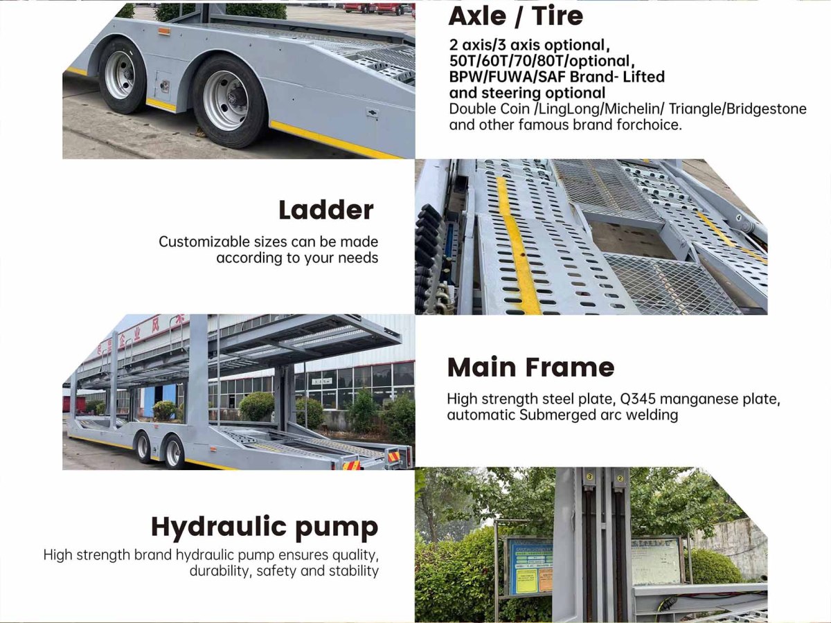 ZW Trailer offers multiple length and deck layout options to match different vehicle mixes and operational priorities. Typical setups support two decks for maximizing vehicle counts, but decks may be specified as fixed or hydraulically operable depending on preference. The product can be configured as a 7 Car Carrier Trailer layout in many markets, balancing spacing and ramp geometry to safely load sedans, small SUVs and compact vans.